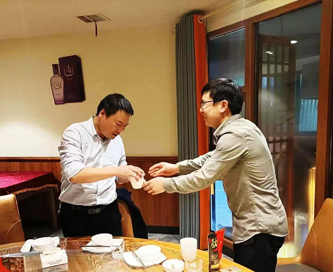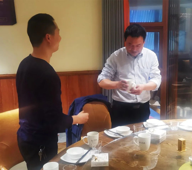 在宴會上,劉洋、丁永繼兩位徒弟向師傅劉美林總經(jīng)理行拜師禮——首先向師傅深深鞠躬:表示在今后的工作中一定誠心、細心、虛心地向師傅學習請教。盡己所能處理和解決工作中的常規(guī)問題,遇事多征求師傅意見;同時會多看些企業(yè)管理方面的書籍,也希望在座的各位干部多多指教。接著,兩位向師傅敬茶。